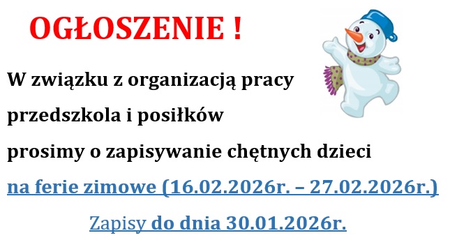 Składanie deklaracji przez Rodziców o kontynuowaniu wychowania przedszkolnegow roku szkolnym 2026/2027(dotyczy dzieci obecnie uczęszczających do przedszkola) Informujemy, że do dnia 30.01.2026r. należy złożyć deklaracjęo kontynuowaniu edukacji przedszkolnej na kolejny rok szkolny, tj. 2026/2027. Deklaracje wydawane będąprzez nauczycielkiw poszczególnych grupach. Brak złożenia wypełnionej deklaracji w wyznaczonym terminie jest jednoznacznyz rezygnacją z miejsca w przedszkolu od dnia 1 września 2026 r.