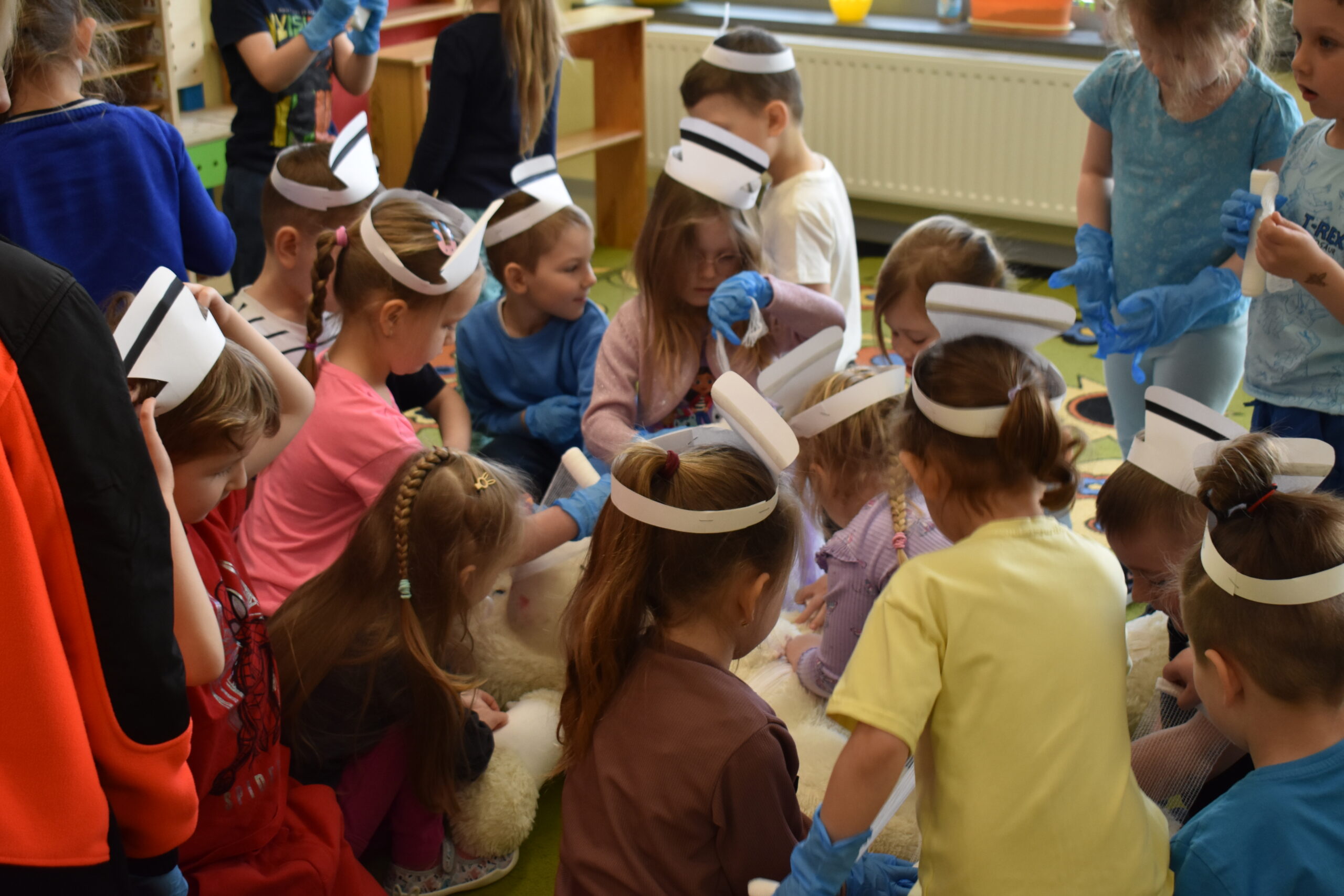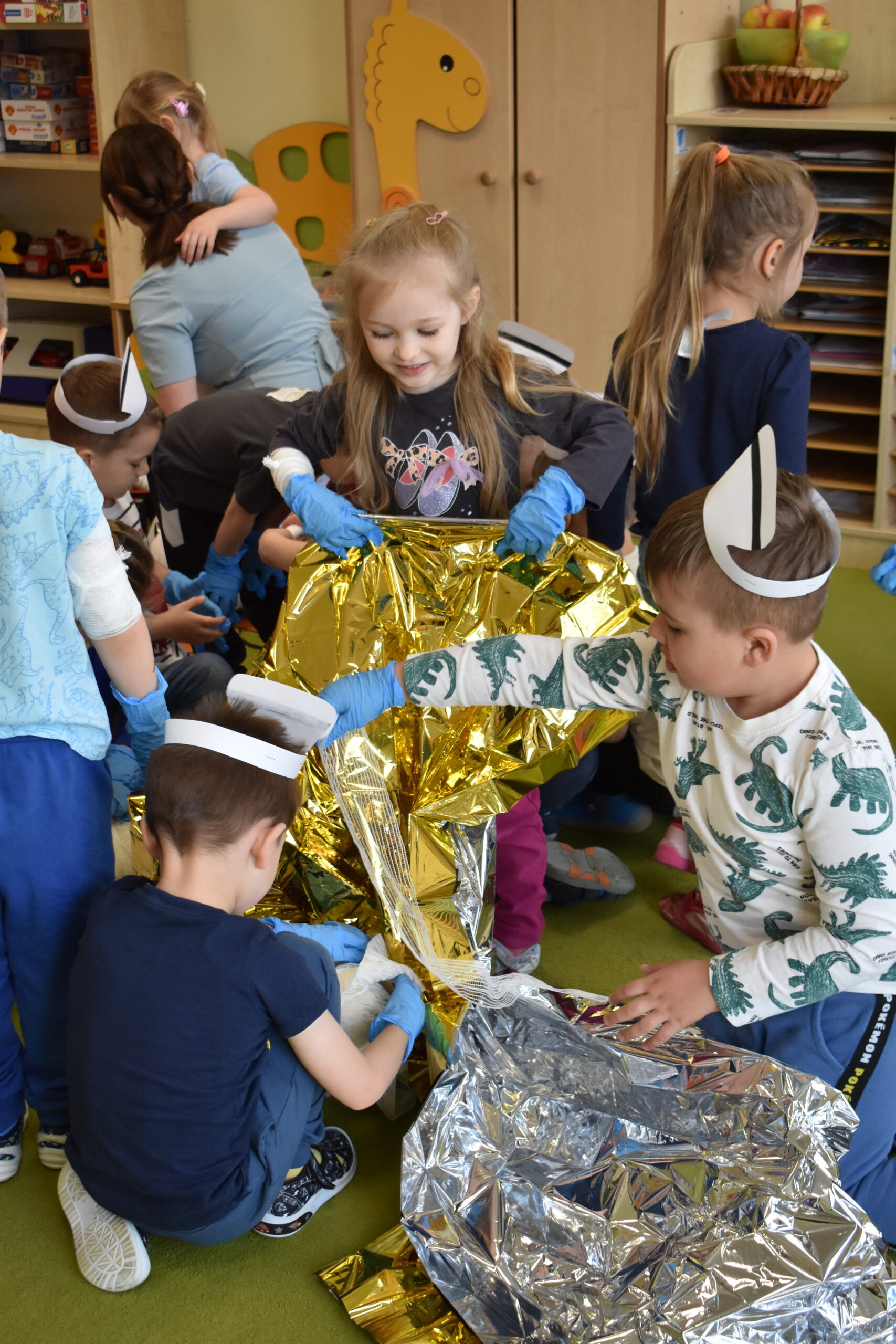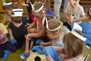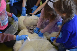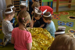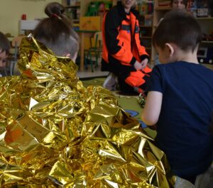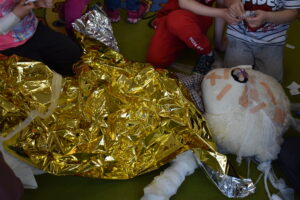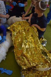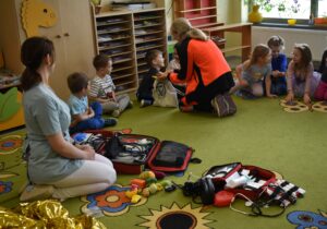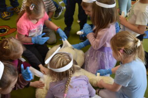 Następnie dzieci przystąpiły do ratowania misia, który potrzebował pomocy po niefortunnym upadku na rowerze. Założyły opaski pielęgniarskie, rękawiczki ochronne i z zapałem przyklejały misiowi plasterki, bandażowały, badały puls i ciśnienie, a nawet okryły go kocem. Przedszkolaki były bardzo zaangażowane i wiele się nauczyły.
